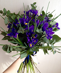 Букет «Фантазер» выполнен в темных тонах, тут к фиолетовым ирисам добавлен темно-зеленый эвкалипт. Такое сочетание способно порадовать любого человека. Ирисы на языке цветов означают искренность, верность и хорошее отношение. Отлично подойдут как приятный жест для друга или поздравление коллеге. Букет поможет подарить яркие эмоции и выразить уважение.