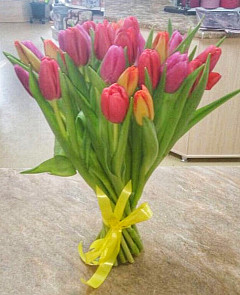 Букет состоит из палитры разноцветных тюльпанов. В этой композиции гармонично дополняют друг друга нежные розовые, невинные белые, яркие оранжевые и великолепные сиреневые цветы. Каждый из них имеет собственное значение, но все вместе они символизируют целую гамму эмоций, которые испытывает человек к получателю подарка. С помощью такого букета вы можете выразить неподдельное искреннее чувство симпатии и подарить любимому человеку положительные эмоции и невероятное эстетическое удовольствие.